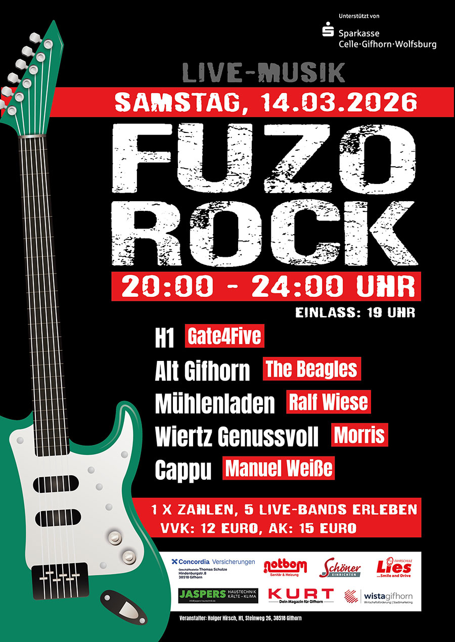 Am 14. März 2026 wird Gifhorns Fußgängerzone wieder zur Bühne: Beim FuZo-Rock erleben Besucher einen Abend voller Live-Musik und besonderer Atmosphäre.